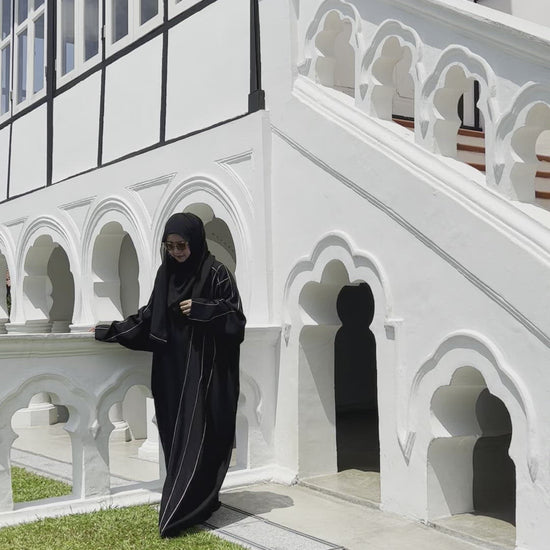 Ainy is a classic black abaya with a relaxed fit. Cut like a batwing abaya but slimmer and with sleeves that fit straight from the elbows to the wrist. Ainy is a comfortable, pretty abaya with minimal embellishments that makes it suitable to wear for simple ocassions, classes or even to visit your family.