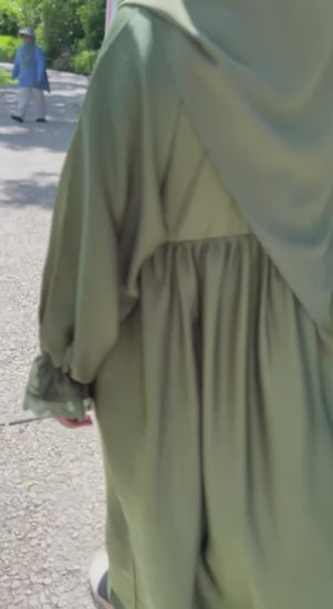 Farha means happiness. Relaxed fit, made with multi pleated around the chest and back, giving comfort and coverage as you move for work, play and especially for your ibadah. No worries love. Farha keeps you happily modest!